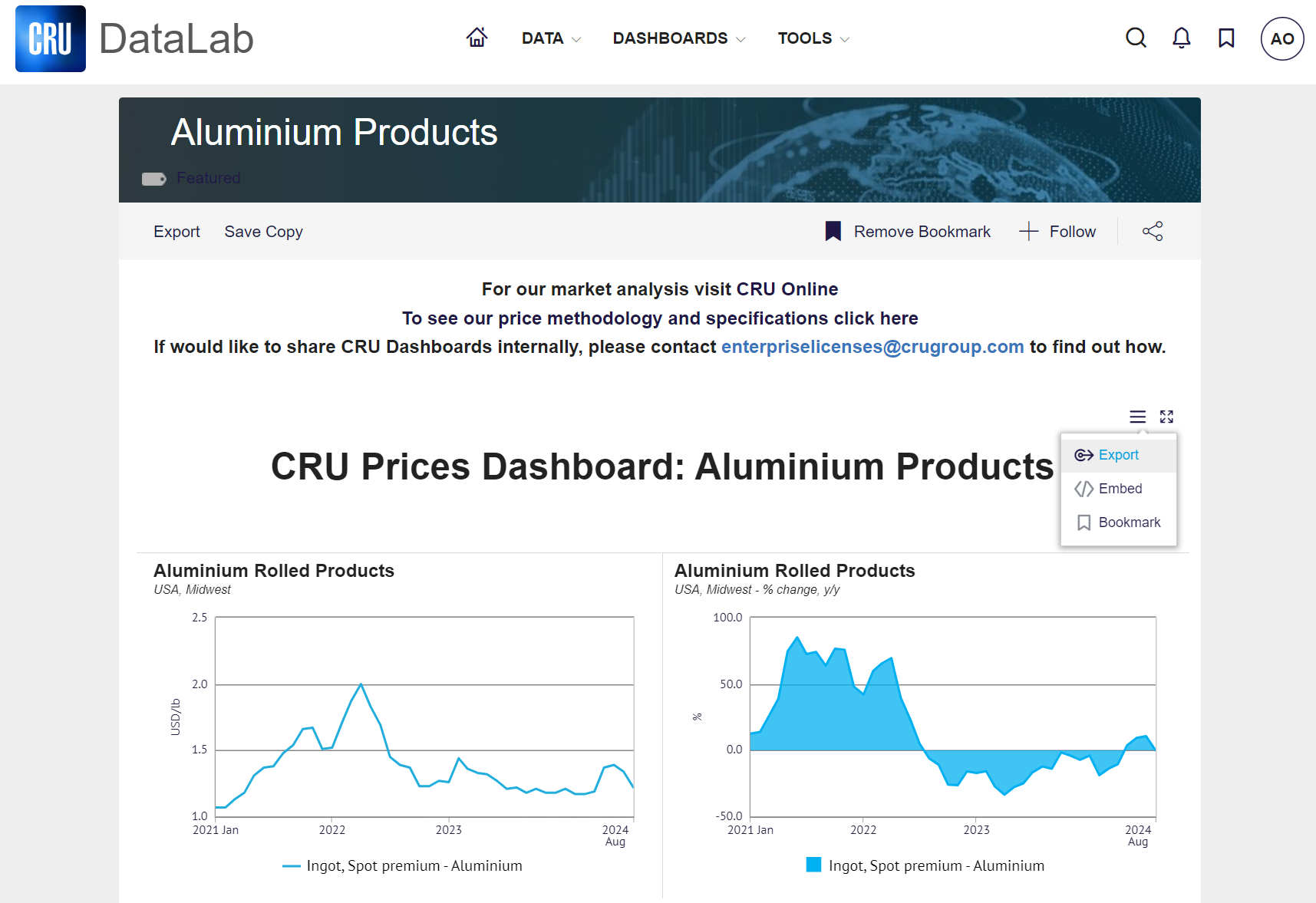 CRU DataLab available via CRU Online, is our cloud-based platform,  that makes it easy to access and analyse data, to get insight fast. It enables centralised analysis, visualisation and download of CRU’s commodity price, costs  emissions and supply and demand data.